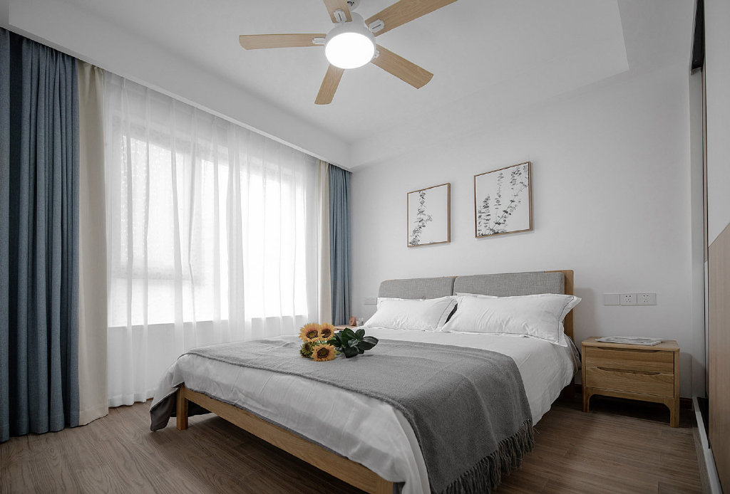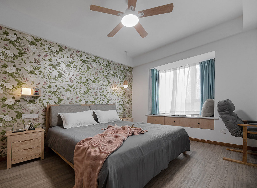 卧室铺贴木地板,原木床和护墙板让空间更加温馨。卫生间的面积虽然比较小,但却是整个家居空间中十分重要的部分。卫生间装修不仅要保证基本的生活需求,还要确保舒适和安全。