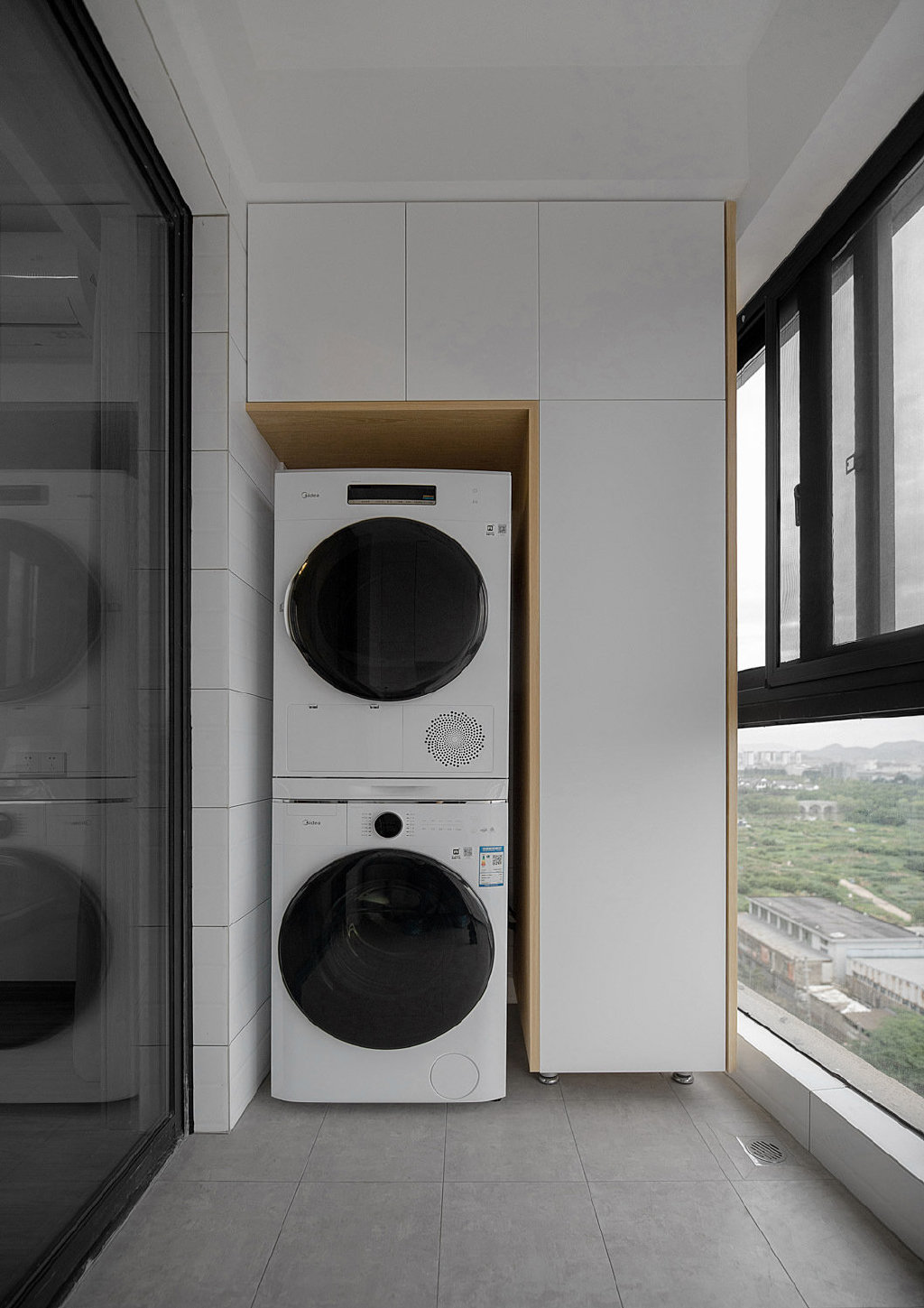 生活阳台则是洗、凉兼备的。到顶的收纳柜以及嵌入式的烘洗一体式的洗衣机。