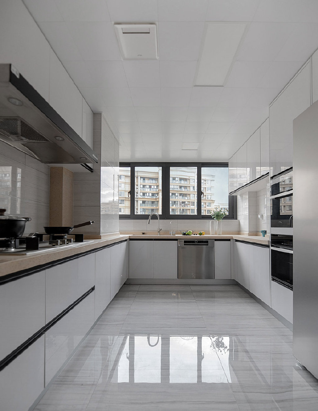 厨房看上去应该干净、整洁,我们需要合理的安排出收纳的空间。可以在吊顶的下面打造一些吊柜,另外吊柜与操作平台之间的间隙也可以利用起来,易于放取一些烹饪中所需的用具,有的还可以作为简易的卷帘门,避免小电器落灰尘。