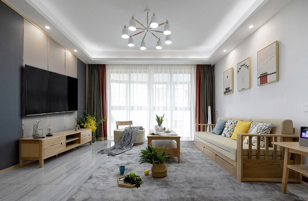 整体以简约自然的原木风格为主调,在灰色调的空间里,营造出舒适清闲的惬意氛围,这样的氛围也正是年轻人所热衷的舒适生活空间感。客厅是最主要的公共活动空间,不管是否做人工吊顶,都必须确保空间的高度性。另外,还要确保客厅从任何角度看都有美感。