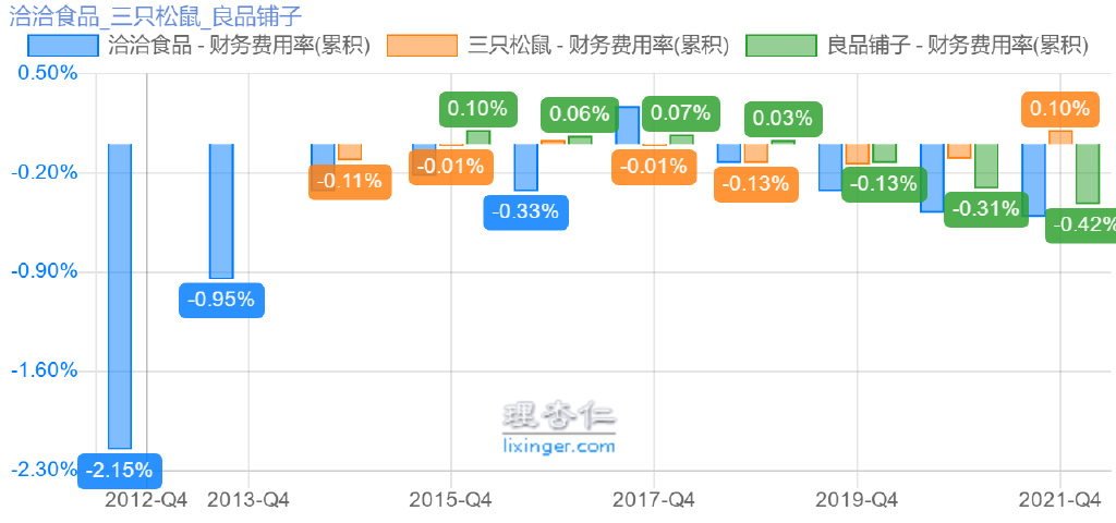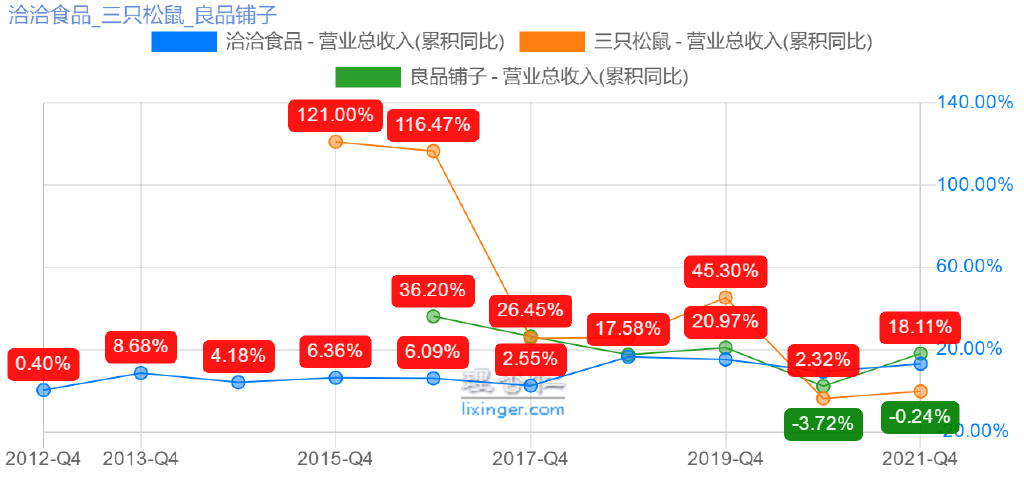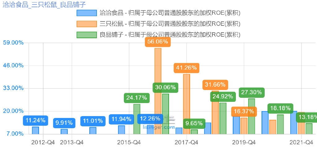 ROE上,恰恰食品在20%左右,三只松鼠在15%左右,良品铺子为13.1%。