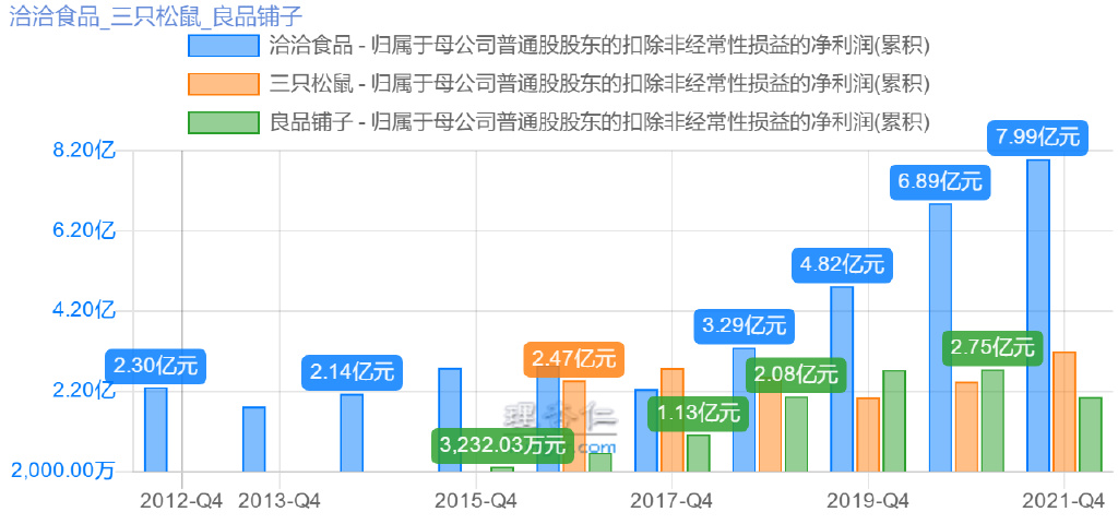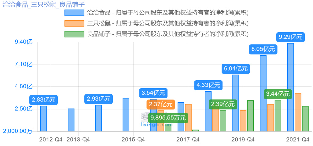 净利润上,洽洽食品的优势明显为9.29亿,三只松鼠和良品铺子在一个水平为4亿左右。