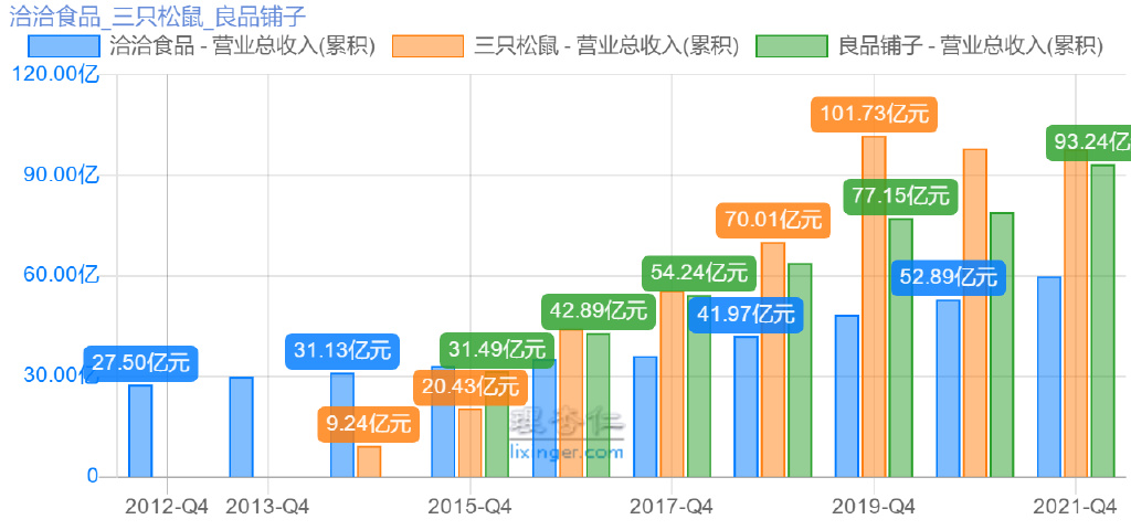 营业总收入上,2015年之后三只松鼠、良品铺子发展势头很猛,截至目前,三只松鼠和良品铺子旗鼓相当在93亿左右,洽洽食品在60亿左右。