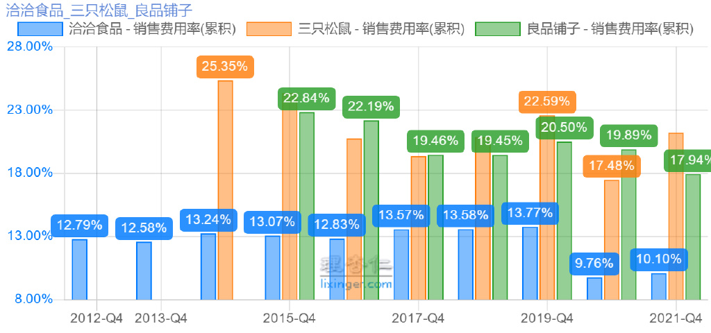 销售费用率上,三只松鼠最高为20%,良品铺子次之为17.9%,洽洽食品最低为10%。