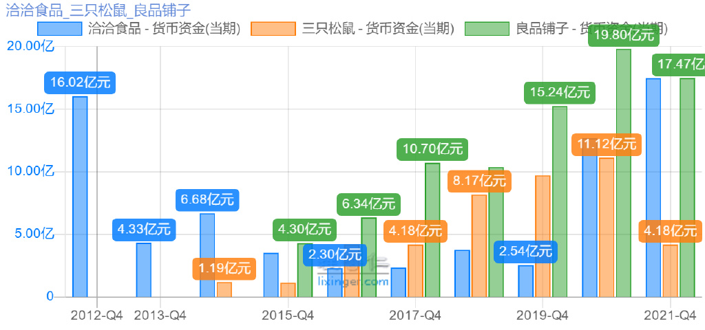 货币资金上,洽洽食品和良品铺子相当为17.5亿,三只松鼠最低为4.1亿。