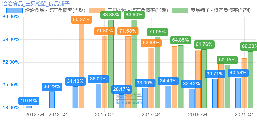 资产负债率上,良品铺子最高为60%,三只松鼠次之为50%,洽洽食品最低为40.5%。