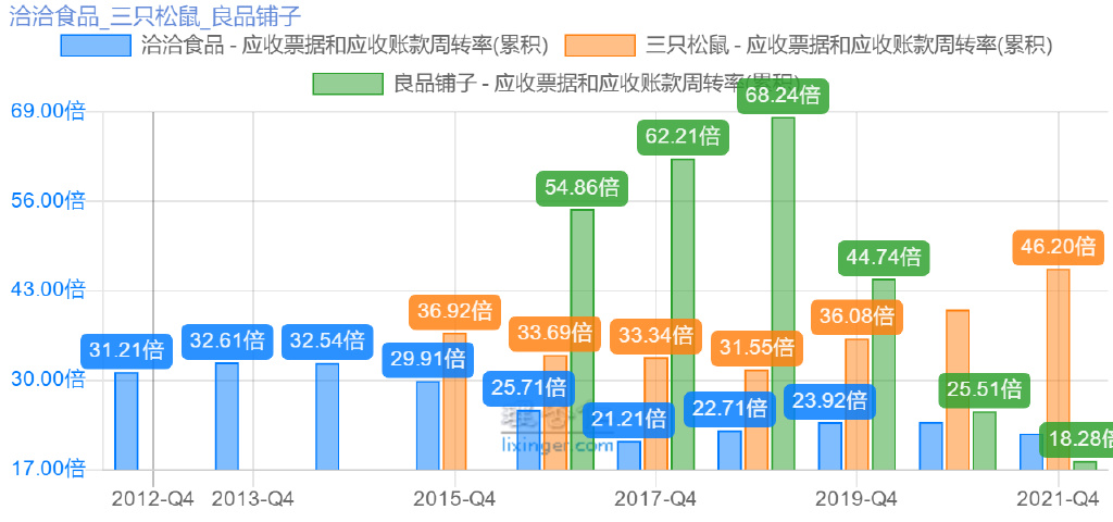 应收票据和账款周转率上,三只松鼠最高为46倍,洽洽食品为23倍,良品铺子为18倍。
