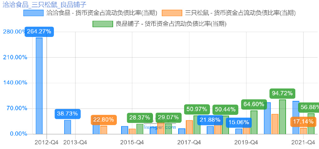 货币资金占流动负债比例上,洽洽食品最高为95%,良品铺子次之为56%,三只松鼠最低为17%。