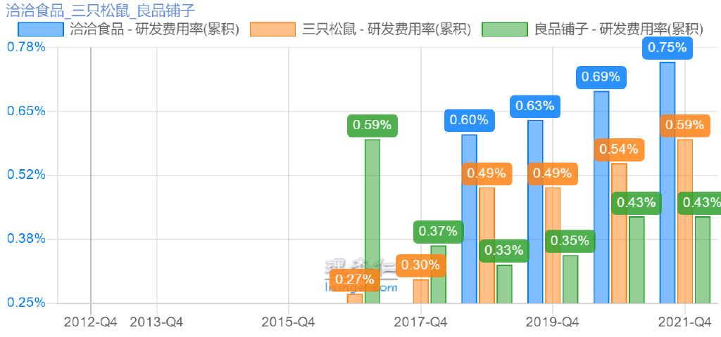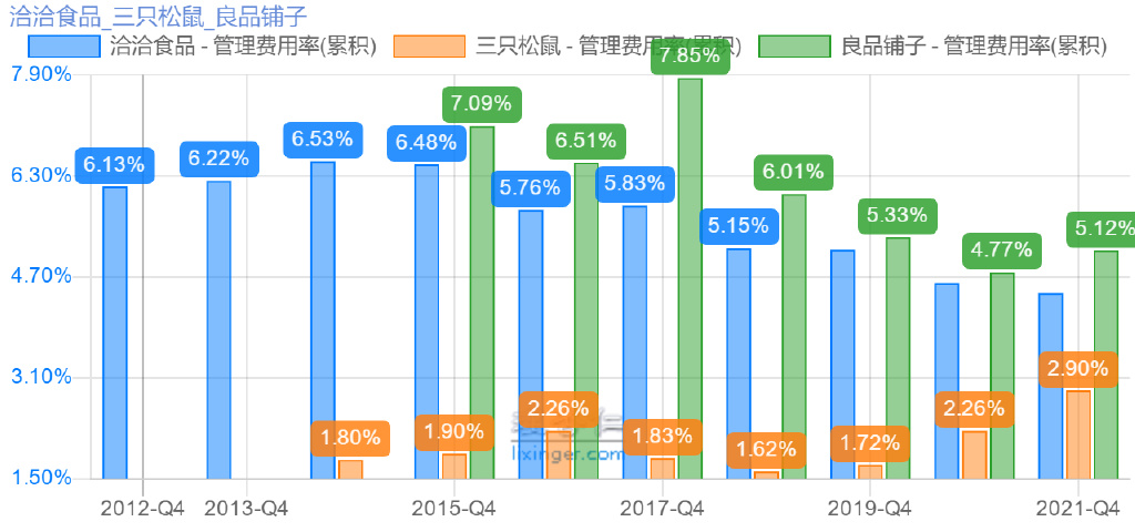 管理费用率上,良品铺子最高为5%,洽洽食品次之为4%,三只松鼠最低为2.9%。