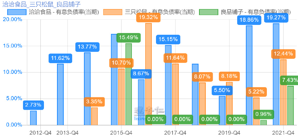 有息负债率上,洽洽食品最高为19.2%,三只松鼠次之为12.4%,良品铺子最低为7.4%。