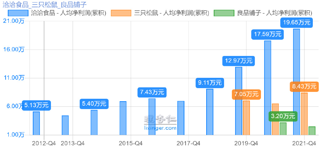 人均净利润上,洽洽食品最高为19万,三只松鼠次之为8.4万,良品铺子最低为3万元左右。