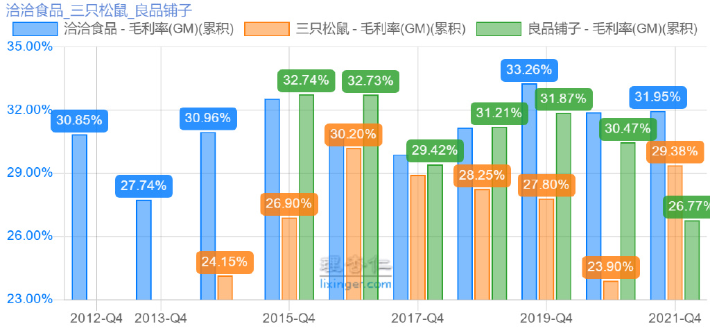 毛利率上,洽洽食品的毛利率最高为32%,三只松鼠次之为29%,良品铺子为26.7%。