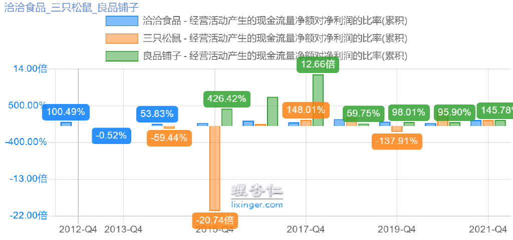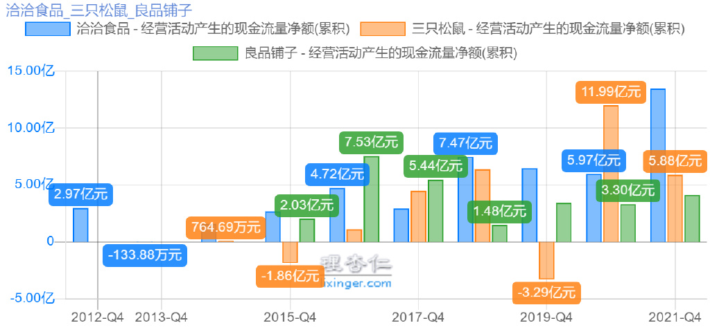 现金流上,洽洽食品>三只松鼠>良品铺子。