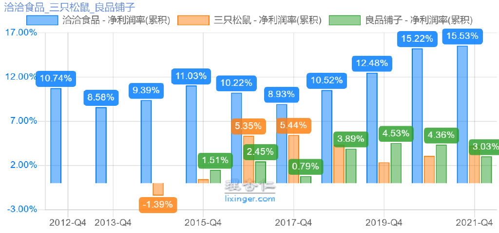 净利率上,恰恰食品最高为15.5%,三只松鼠和良品铺子在一个水平为3%左右。