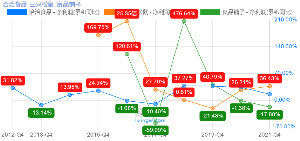 净利润增速上,恰恰最为稳定大概在20%左右波动,三只松鼠和良品铺子波动比较剧烈。