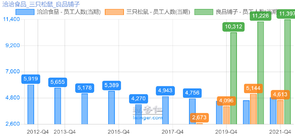 员工人数上,良品铺子最高为11397人,洽洽食品和三只松鼠相当为4600人左右。