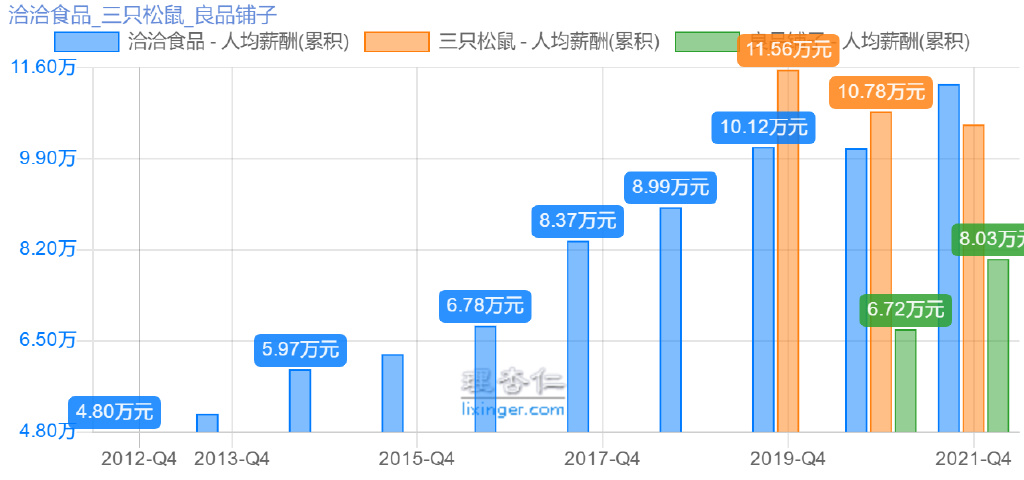 人均薪酬上,洽洽食品最高为11万,三只松鼠次之为10.5万,良品铺子最低为8万。