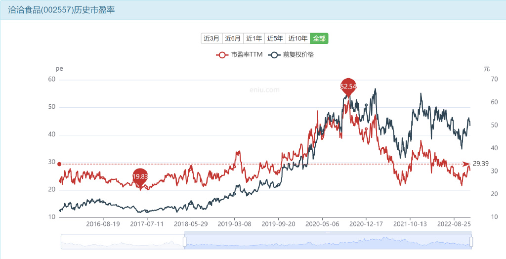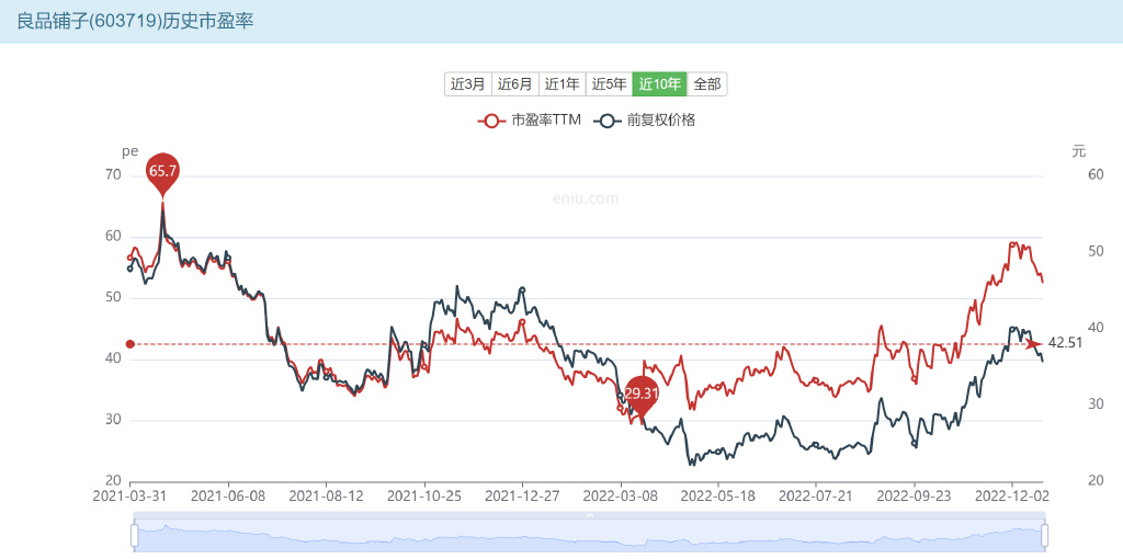 良品铺子的市盈率为40倍,略低于42倍的近十年平均PE。