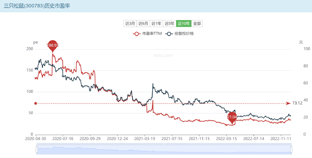 三只松鼠估值为40倍左右,低于近2年的平均的73倍的PE。