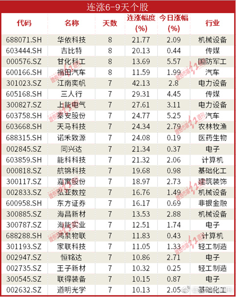 经过7连涨后,今天放量涨停突破。今日有4只8连涨个股,有20只7连涨个股,59只6连涨个股,由于只数太,表中只列出了累计涨幅超过10%的个股。