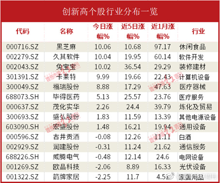 今日新高股有14只,比昨天少1只。新高股中没有两只的行业相同,说明资金均以个股为战,缺少题材热点。
