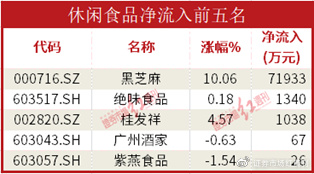 休闲食品板块中流入过亿的个股只有黑芝麻1只,流入达7.19亿元,并以涨停报收,但并没有激起板块活性。