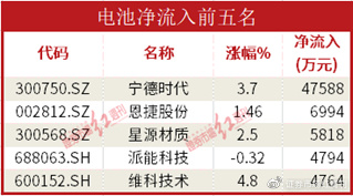 电池板块也只有宁德时代1只个股流入过亿元,流入4.76亿元,涨幅3.7%。