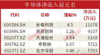 半导体板块获大额流入的只有长电科技1只个股,涨幅4.5%,流入额1.11亿元。板块内大港股份与卓胜微虽然资金流入不大,但涨幅均超过5%。
