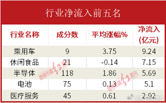 资金流入行业前五位是乘用车、休闲食品、半导体、电池与医疗服务板块,其中乘用车板块机构资金流入9.2亿元,休闲食品板块流入7.22亿元,半导体板块流入5.7亿元,电池板块流入5.1亿元,医疗服务板块只流入了2.9亿元。流入最多的个股是黑芝麻,机构资金流入额7.14亿元。