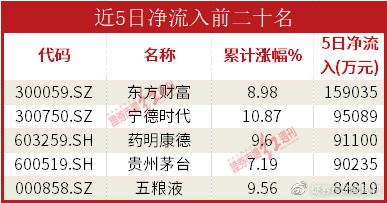 近5日累计流入超过10亿元的只有东方财富1只,累计流入15.9亿元。另外宁德时代与药明康德同时进入前五,流入分别为9.51亿元与9.11亿元。另外贵州茅台排名第四,流入9.02亿元,五粮液排名第五,流入8.48亿元。