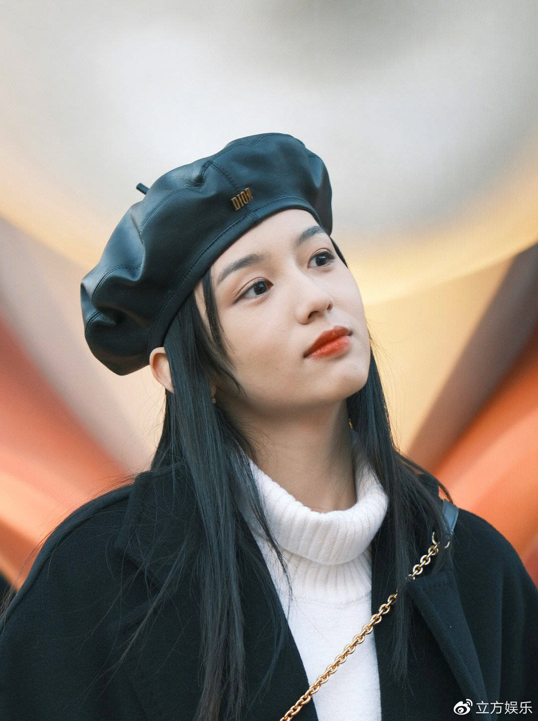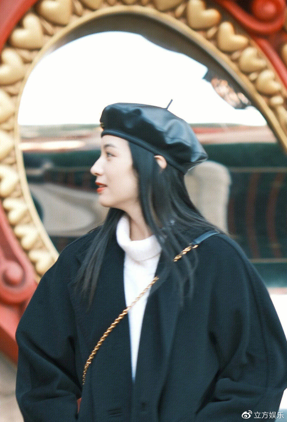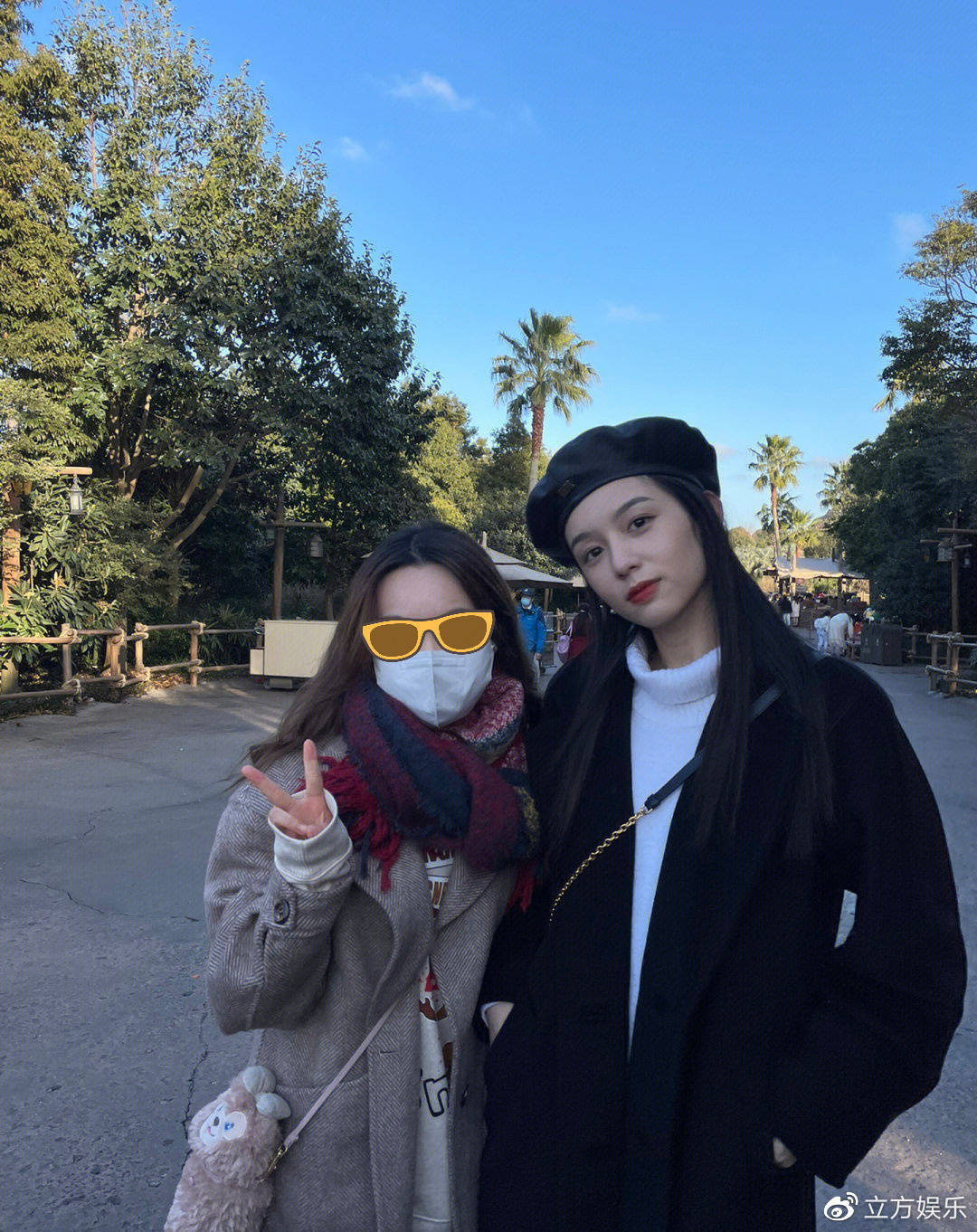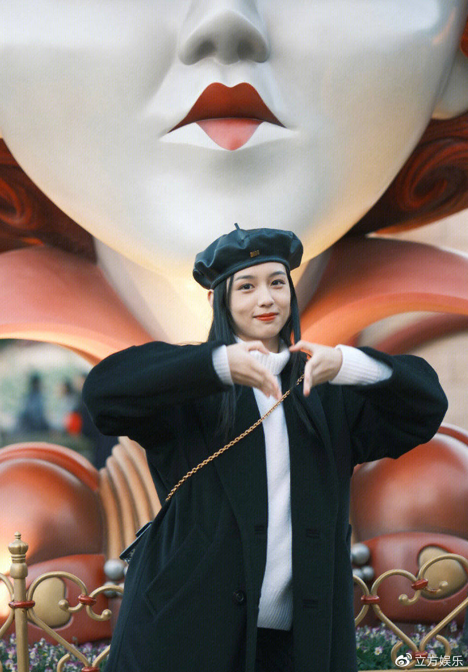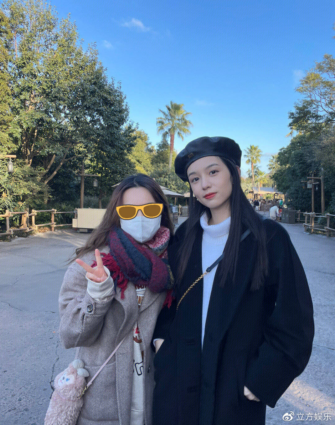 1月11日,有网友在上海迪士尼偶遇周也,图中周也穿着黑色大衣,戴着同色系贝雷帽,十分大方的和粉丝合影。