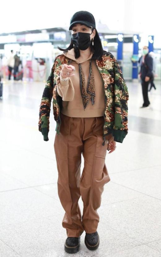 对于年龄偏大的女性来说,她们可能平日搭配更喜欢尝试一些花花绿绿的服装,就像钟丽缇这一件印花外套,也是很多成熟女性比较偏爱的服饰,叠穿上棕色的卫衣还是挺休闲的。皮裤的搭配更是能增强她的气场,深棕色皮裤和印花外套混搭也会显得别具一格,整体搭配风格也更加时髦。