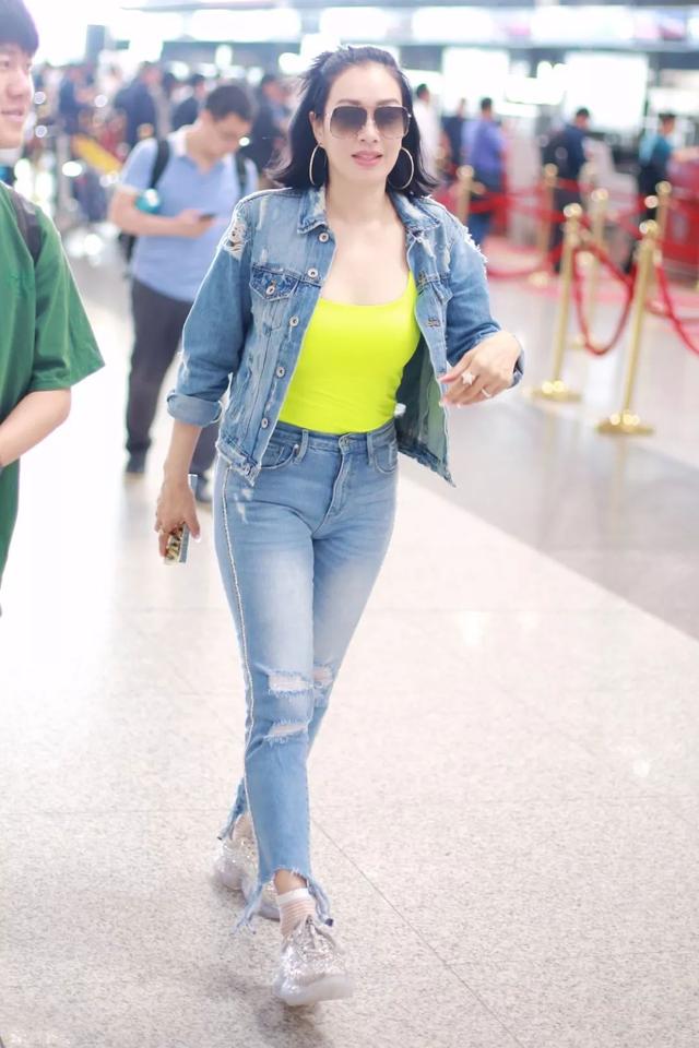 牛仔外套风格比较休闲,平日穿搭就可以用起来,而钟丽缇这一件蓝色牛仔外套的穿搭还是非常简单的,瞬间就能够展现出活力满满的气质。看上去很年轻,同时还混搭了荧光色的打底衫,提亮它整个造型。