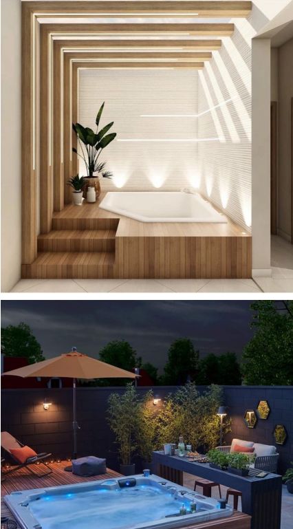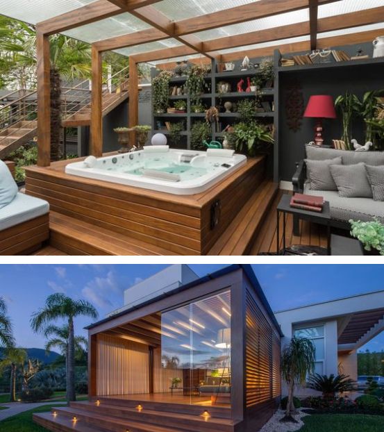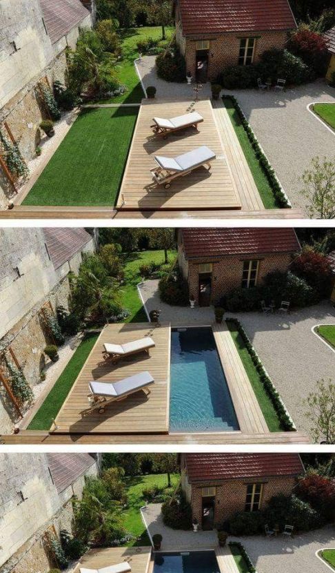 如果又担心在院子里装泳池容易弄脏的,这里也有个小技巧,直接给泳池上加个可移动的甲板做盖子,平时用不到泳池时盖起来,这时这上面也是一个休闲区,一地两用!打开时甲板向一旁移动,也不会多占地方。