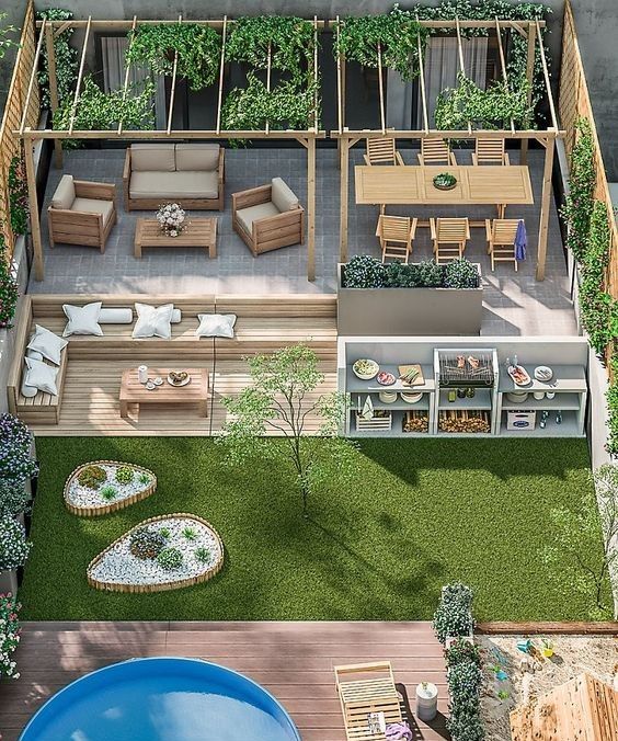 当然了,家里院子面积富足的,完全可以将廊架休闲区和泳池做成分离式的,廊架下摆沙发椅、打造餐厅以及户外烧烤区,一旁是观景区+泳池,周末邀请三两好友在家聚餐,不要太舒服哦~那需要出去找娱乐场所,拥有一个院子,布局到位在家就能应有尽有。