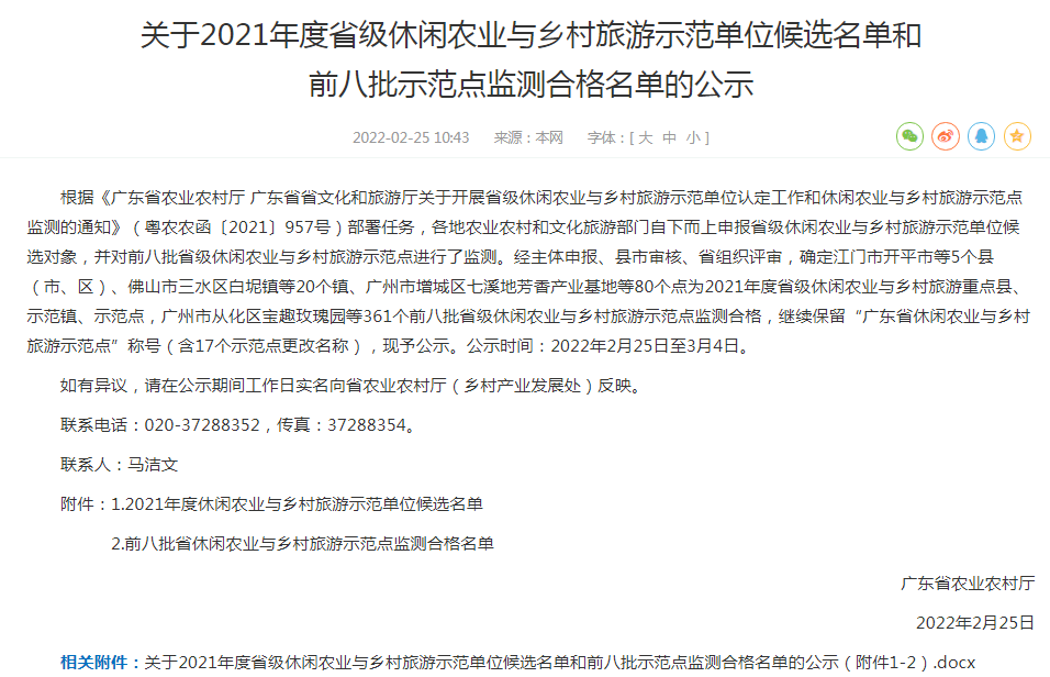 2月25日,广东省农业农村厅公示2021年度省级休闲农业与乡村旅游示范单位候选名单和前八批示范点监测合格名单。