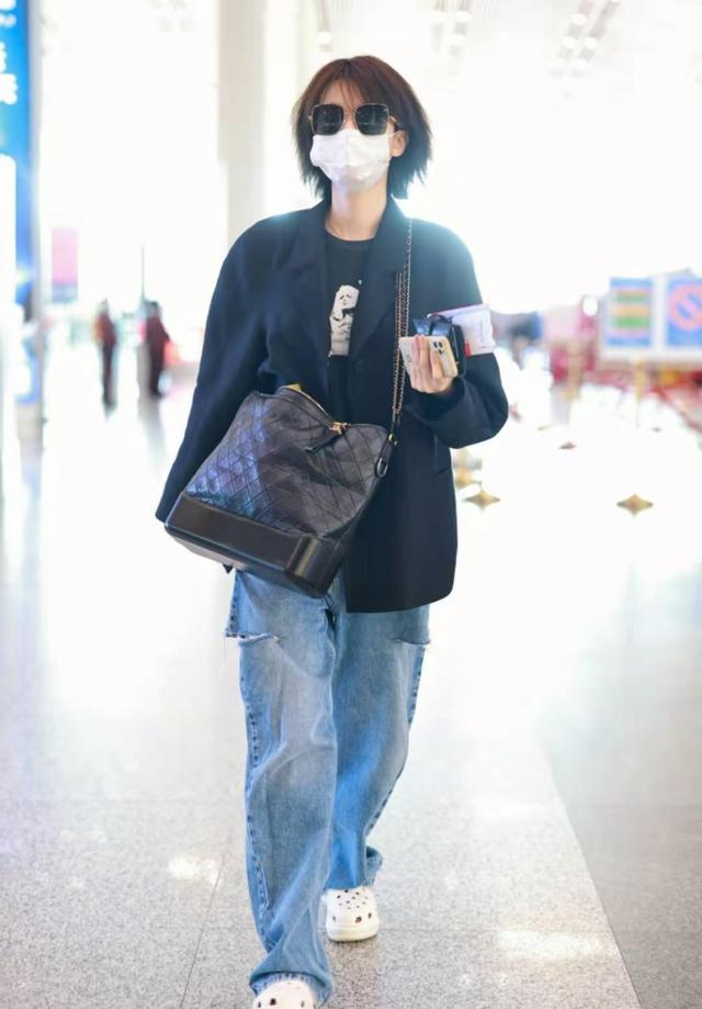 虽然牛仔套装的减龄效果很好,但牛仔套装时尚感一般,并且因为牛仔套装没有什么穿搭技巧,穿它的人很多,这也就意味着牛仔外套驾驭难度相当高。觉得自己驾驭不了的话,可以向乔欣学习,把牛仔裤裤脚塞进鞋子里,穿出工装风的感觉。