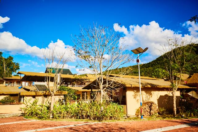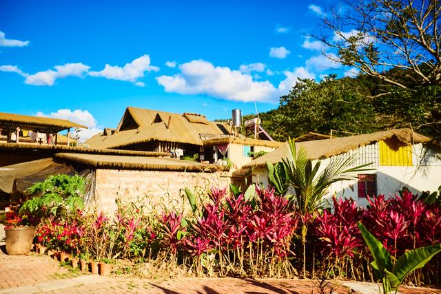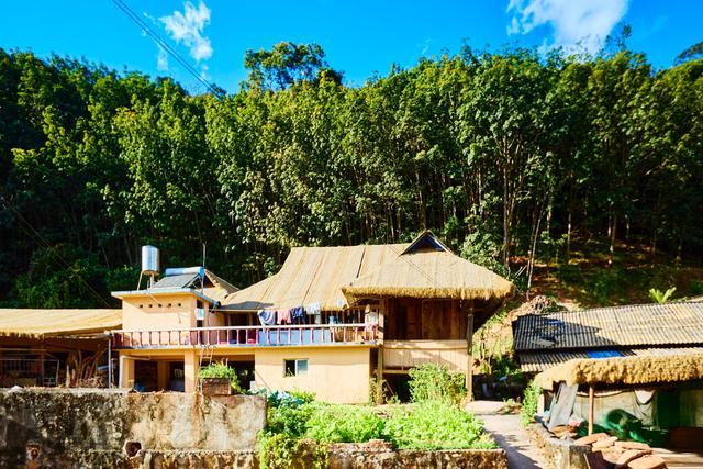 村中民居保留了哈尼族传统的茅草顶风格,土黄色墙面搭配层层叠叠的茅草屋顶,房前是姹紫嫣红的热带植物,蓝天白云做背景,随手一拍都是浓郁的边境乡村风情。