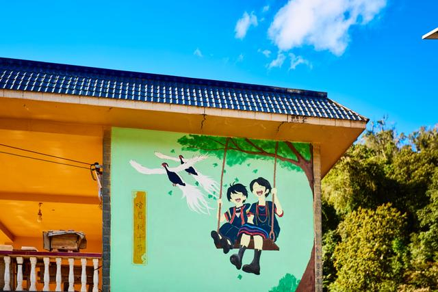 哈尼族生活、劳作、民俗活动的场景生动描绘在墙上,颜色鲜艳,图案生动,是磨站村拍照出片的好地方。